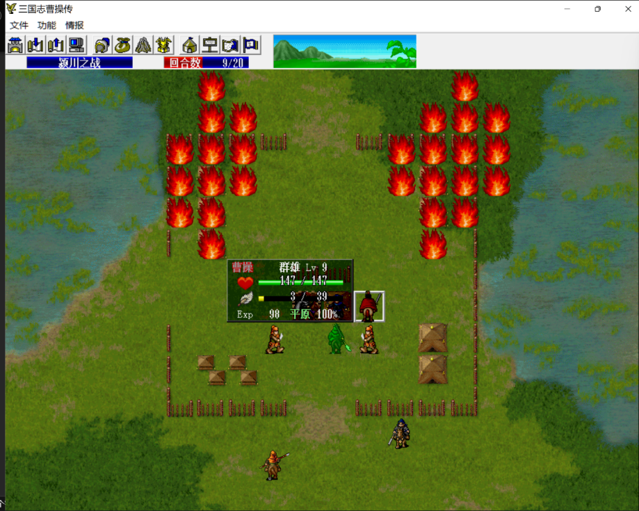 第9回合,曹操走到张梁的右侧,进行最后一次小补给,经验值来到了98,MP值只剩下3。