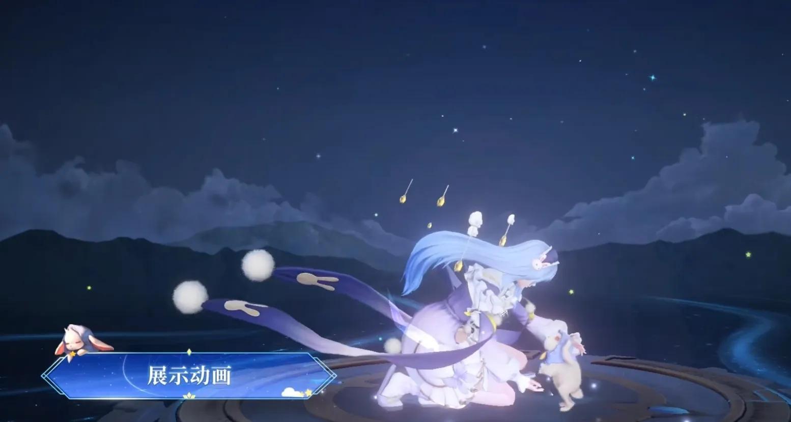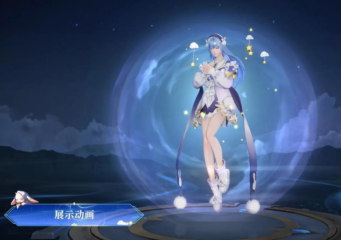 皮肤的背景故事简单而不单调,角色形象设计方面则是有所创新,以柔软的原则将棉球,软绵小兔等装饰融入到细节当中,并且在飘带和棉拖鞋上还有一些毛绒球的设计。沙发上挂着的云朵星星装饰灯摇曳在嫦娥周围,给人一种温暖可爱的感觉。