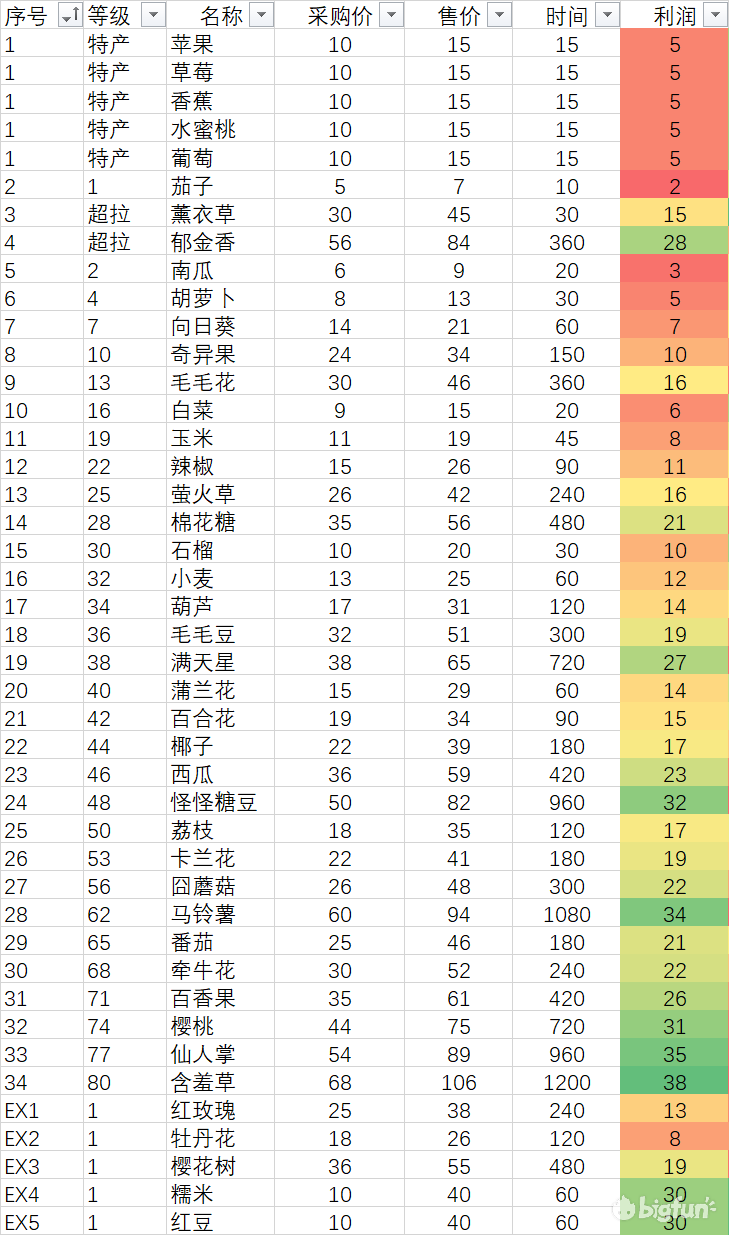 最后放一个全部作物按利润降序的图,方便有需要的查看