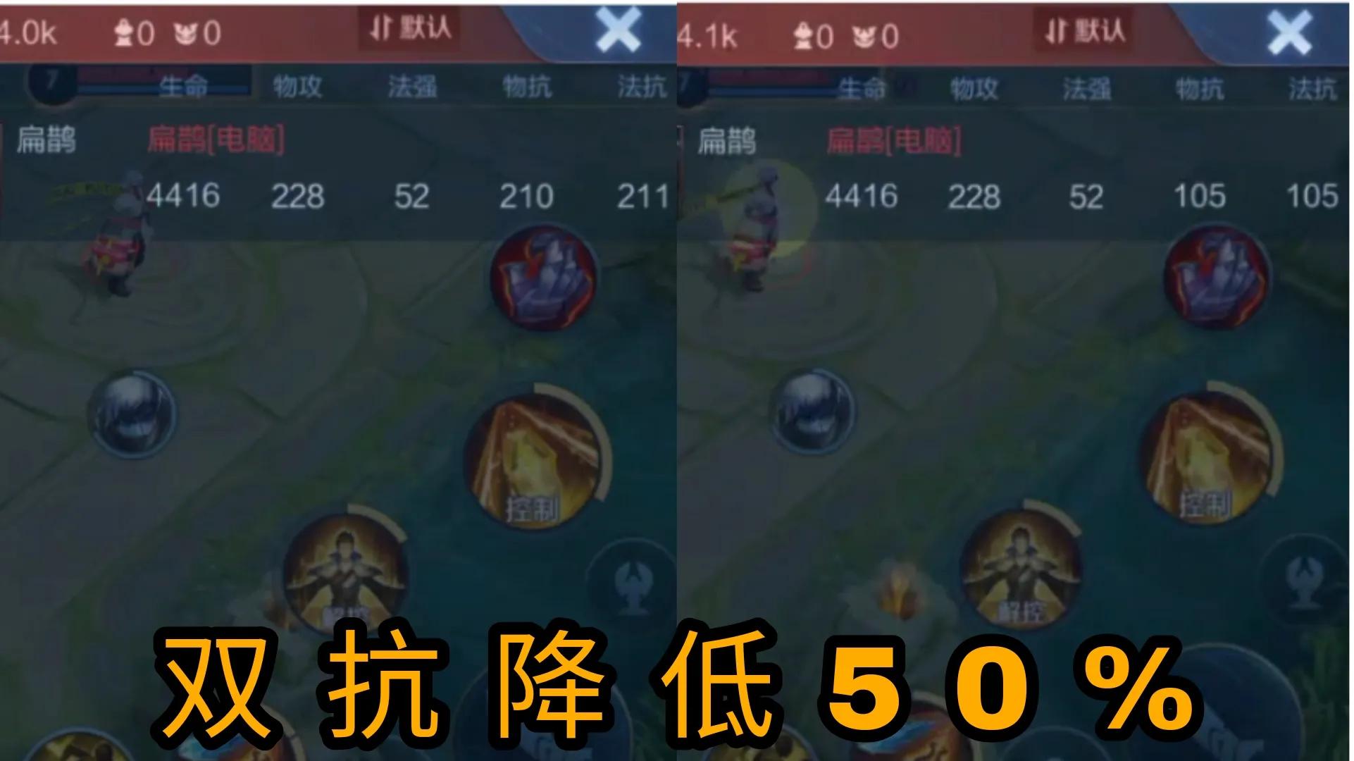 大家看这里敌方扁鹊的,物抗是210法抗是211,在被狄仁杰大招命中之后,物抗变为105,法抗也变为105,刚好都减少了50%。