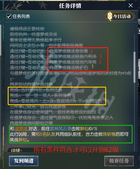 包括了任务材料(所需材料成长礼包中有,礼包丢了的或者没开的自己到了60级之后去副本里捡,实在再没有的话只能去买。。不过比较贵)、主线完成和支线完成以及要打一次武林风云录的第二个boss,所以注意留一次武林风云录老二的cd。