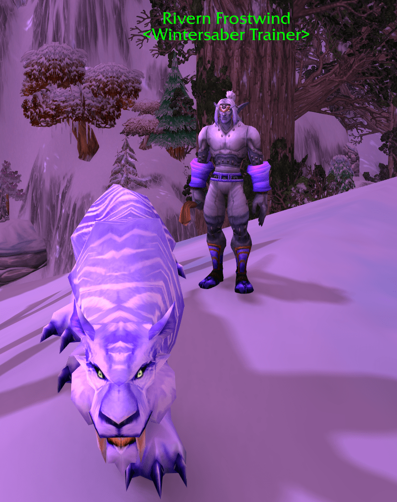 这个声望的相关NPC就只有霜刃豹训练师一人,而提升声望的方法更是丧心病狂。你必须一遍遍地从这名训练师手上接任务、杀怪、交任务,再接任务、杀怪、交任务。如此反复数百遍之后,你终于和训练师达成崇拜声望,同时也就获得了从他手中购买霜刃豹的权力。