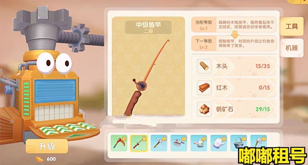 进去之后,可以看到这个大眼睛的机器,然后可以互动来进行升级,玩家可以选择鱼竿,然后耗费35个木头,15个红木,15个铜矿石,还有600个摩尔豆,就可以顺利的升级为中级鱼竿。