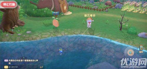 静待一小会,有鱼咬竿的时候,池子里的小拉姆鱼标会上下沉浮,溅起水花~还有我们继几的头顶,会出现一个黄色的感叹号!