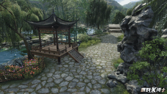 而实时演算的天气系统,以及不同天气下风格迥异的画面表现力,也着实让人眼前一亮。清晨的薄雾、正午的燥热,玩家都能通过画面直观而真切地感受到。山雨来时漫天的的残枝败叶、雨后满地的积水,这些细节无形中提升了武侠网络游戏的画面门槛,也说明《逆水寒》游戏中的粒子效果与环境动态事件已经高度成熟完备。