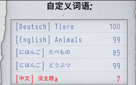 这个中文没主题就是玩家自定义的词库,但是因为词汇不够80个而无法使用,所以显示为红色。
