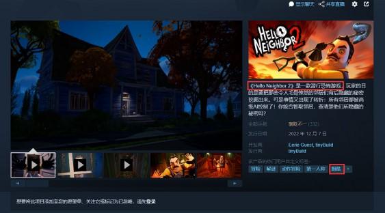 游戏的steam商店页面中有两个值得关注的地方,一个是《Hello Neighbor 2》是一款潜行恐怖游戏,另一个是“跑酷”的用户自定义标签,前者代表了制作组对于《你好邻居2》的官方游戏定位,后者则代表了在实际游玩体验下,本作应当被归为的游戏品类。