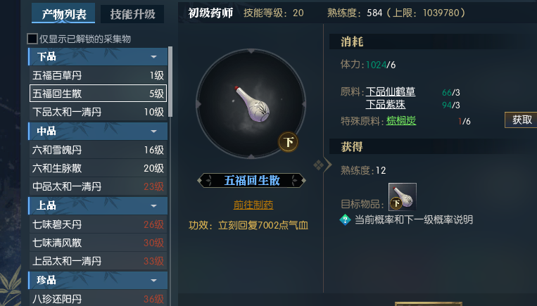 5:所有的号等级上来后全部去学生活技能采药+制药然后全部点到5级开始做药去卖如图所示全部做五福回生散价格可以根据庙会来订只要比别人便宜点就行,原料可以用体力购买生活技能要随着区的等级升级而升级