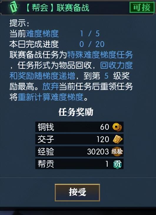 还有就是最关键的收益了,帮会联赛这个是至关重要的最好能进个乙组帮会混,采资源就行,不用去打,这个活动主要是周五晚上8点开始两场然后周六晚上一次场全部打完大概一个号的收益有7W到10W左右如果有嘉奖还不止,这只是一个号的收益如果你号多可想而知,比如一组6*10=60W铜钱两天60W 一组的号这个是纯利润没有任何成本的。(主要产出)想多赚需要量大