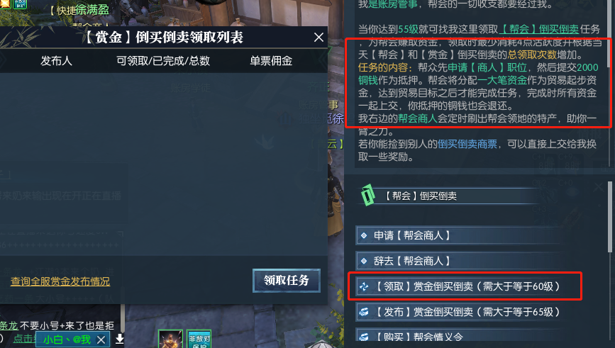 9:帮会里的跑商一定要做如图所示这个如果跑得好一天几十万铜钱前提是帮会有老板发铜票让我们跑,这个就跟倒买倒卖原理是一样的