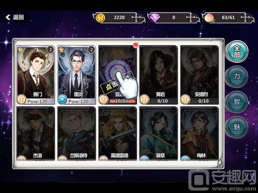角色养成方面,骑士们分为力量、智力和魅力等多种类型。在“骑士”菜单中可以对已有的骑士进行养成,包括对骑士进行升星、净化、装备强化、技能升级,也可以查看骑士的属性、好感度以及与其他骑士的连携关系。不仅可以查看和培养骑士的战斗力,还可以收集资料更加了解一个骑士的设定。在“图鉴”菜单中,可以查看已有骑士的详细资料,通过给骑士送礼物解锁骑士更多资料,包括年龄、血型、身高、星座、喜欢或讨厌的事物等。