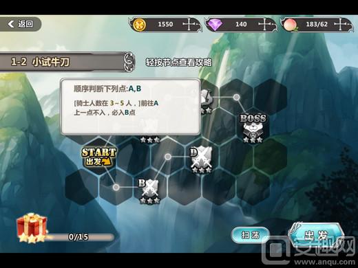 进入副本之后,出现不同数量的六边网格,网格中有不同属性的探索点,除了出发的Start点,还有战斗、资源和BOSS点。与《舰队collection》和《刀剑乱舞》相同,进入每个点都有不同的几率或判定条件,长按一个点可以查看进入该点的具体条件,判定条件有限制参战骑士类型、参战骑士人物等等。