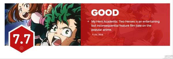 最近,IGN公开了对《我的英雄学院》剧场版动画的评分7.7分, 该片将于2018年8月3日在日本上映,不知在上映后是否会有更高的评价。
