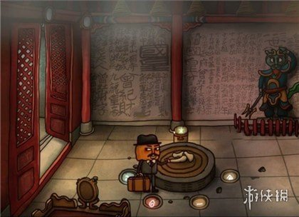 然后往楼下走,走到底有个老道士那里,烧香那里把贡香插上去,旁边泥土埋着纸是关于手电筒的提示,插完香找老道士,这老道士是真有点东西,会给你个玉露,再把磁铁给他,给你吸上来个铁龙头。