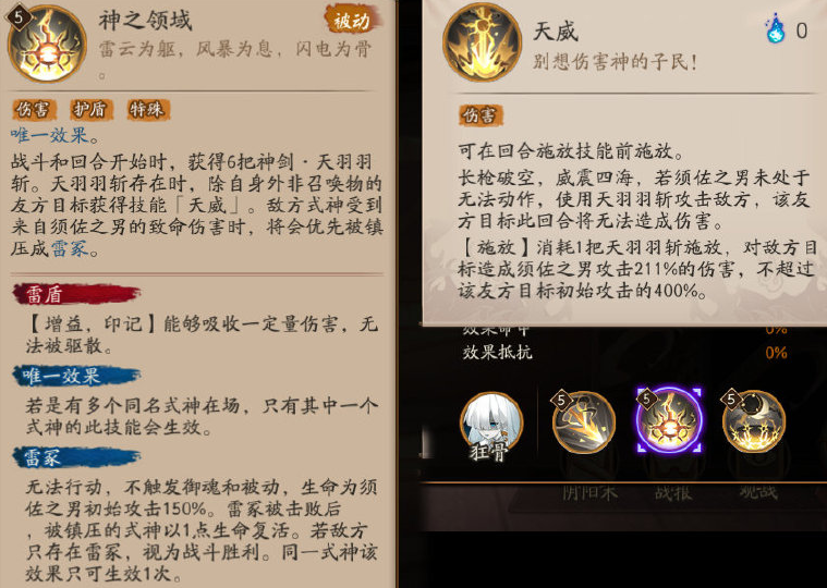 天威:回合释放技能前释放,消耗一把天羽羽斩,211%(满级231%)伤害,不超过该友方目标初始攻击的400%。满级无视御魂,释放天威的时候,须佐获得持续2回合,攻击49%的雷盾,最多叠2层。雷盾无法被驱散。