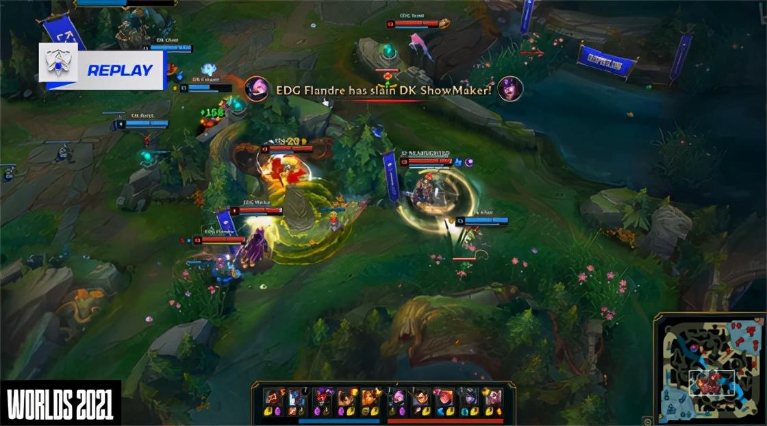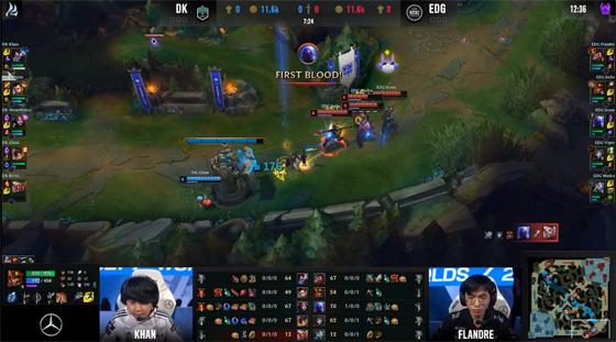 开局双方三线都和平发育,EDG三路英雄都打出了不同程度的压刀领先。瑞兹推完兵线回城后直接传送上线,持续对妖姬施加清线压力。7分钟EDG中野下路大举入侵DK红buff野区,反了红利用瑞兹大招包抄DK下路,吉格斯及时闪现后撤,而洛第一时间W抬飞四人,不料瑞兹致命EW还是拿到洛的一血。