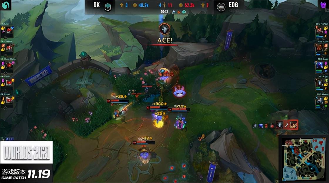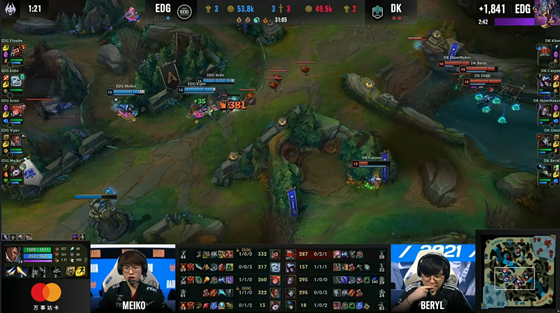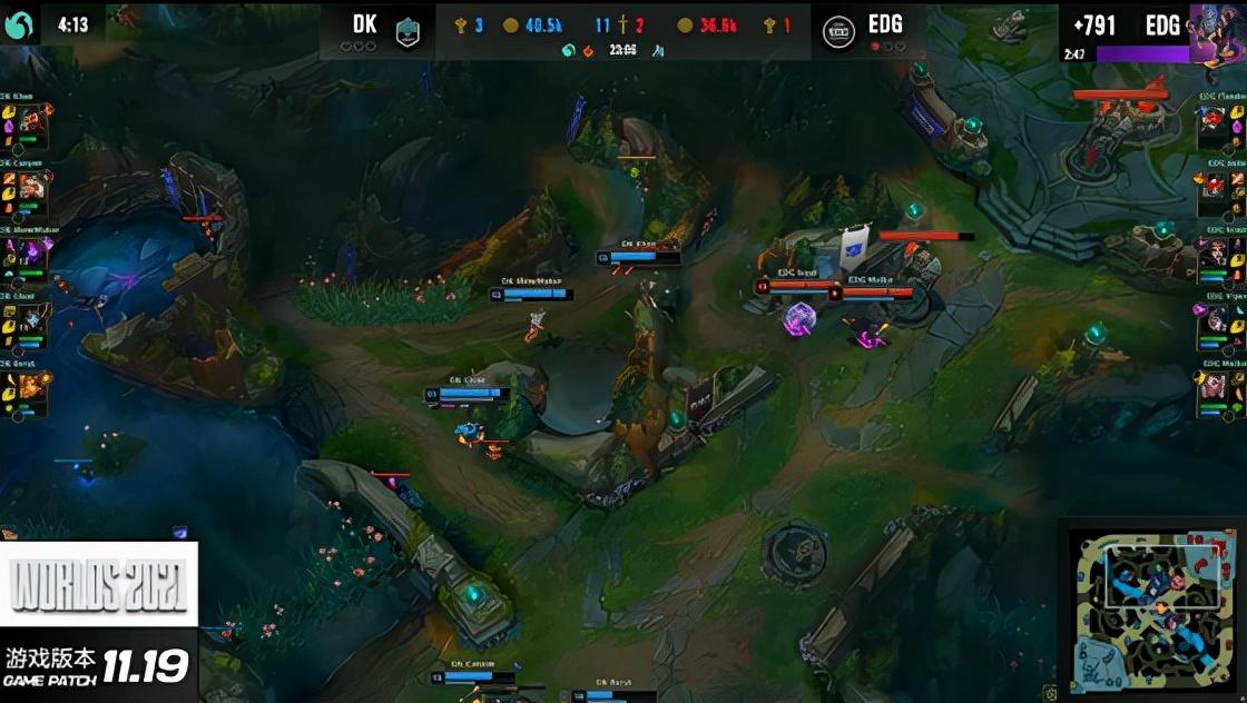 在DK双人组持续凶猛的压制下,卢锡安和璐璐在塔下尝试反打但被消耗了太多血量,男刀顺势前来将两人抓死,补回了不少经济。不过EDG上半区优势还是很大,男枪在佛耶戈的掩护下吃到上路一塔,接下来第二只先锋刷新,男刀在河道走脸被EDG伏击秒杀,DK被迫放弃先锋,前期节奏陷入了劣势。EDG快速控到三条小龙,给DK施加了不小的压力,而DK也在顽强防守寻找机会,在一波中路反推时凭借发条的大招拉到四人秒掉佐伊。不过EDG及时调整过来,在接下来的龙魂团战中从DK手中抢到了土龙魂。