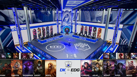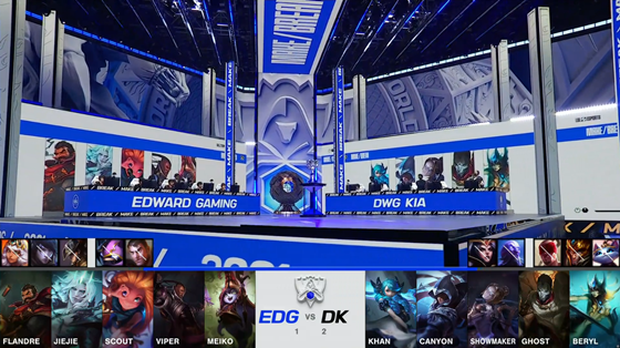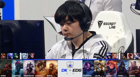 中期双方在小龙河道展开一波顶级拉扯,ShowMaker的塞拉斯复刻了赵信的大招从侧翼进场,开大扫开赵信令盲僧稳稳“听牌”了火龙魂,赵信和塞拉斯互换阵亡,拿到小龙的DK心满意足撤走。27分钟EDG迫于龙魂的压力赶往河道接团,绕后的塞拉斯干扰了EDG的拉扯节奏,乱战中酒桶E闪撞晕EDG双C,和塞拉斯双切后排无人可挡,DK打出1换4解锁龙魂追平了经济差。EDG选择让杰斯单带给压力,DK见招拆招打大龙逼杰斯回防,Canyon的盲僧Q到赵信天秀R闪踢回杰斯,DK打出0换4无压力收下大龙。最终DK在EDG的红buff野区打出1换4一波结束比赛,2-1率先解锁决赛赛点!