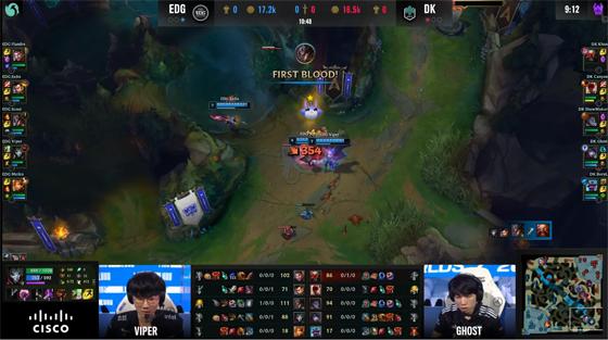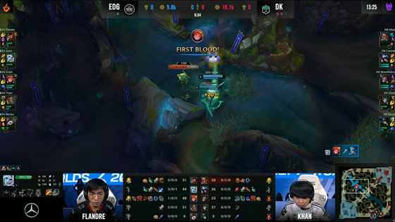 双方打野控完河蟹后都开始寻找Gank机会,赵信在中路打出蚂蚱的闪现,下路洛被开到奇亚娜现身逼出了卡莎的闪。妖姬利用线上领先的一个TP在上路吓出了男枪的闪现,双方的博弈非常焦灼,8分半DK众人集结到上半区,EDG尝试先手正在蹭经验的曙光,但是曙光比较轻松地躲开了,DK顺势拿到了第一只先锋。12分钟左右妖姬在塔下想要消耗蚂蚱的护盾,结果被冥府之握压制,奇亚娜补上伤害帮蚂蚱拿下了一血。