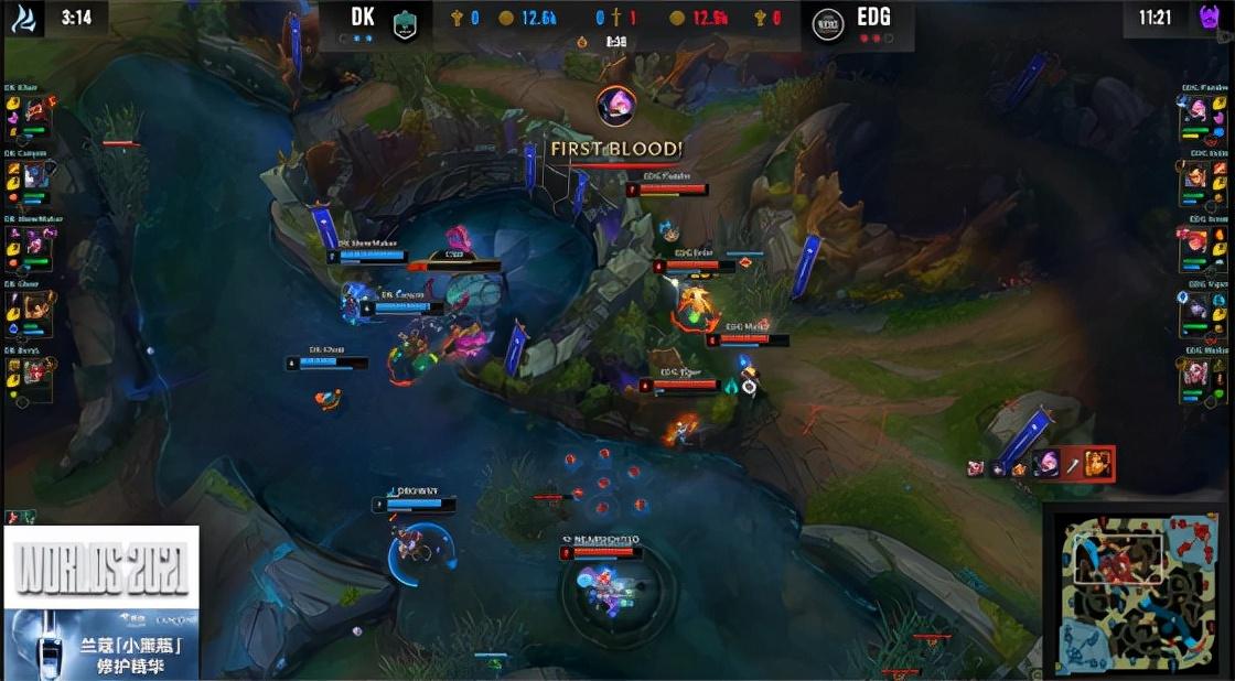 DK为了拆掉EDG的卢娜组合不惜选出娜美搭配烬,EDG只能选出璐璐来应对。佛耶戈前期潜入DK野区反掉男刀蓝Buff,同时EDG双人组向野区靠拢逼退男刀,使得男刀开局非常难受。格温交TP回线后大招强行推线,还想要去河道吃蜜糖果实补血,但被EDG的中野抓到,一血被佐伊收下。男刀见状立刻在下路尝试越塔,可是卢锡安和璐璐非常极限地避开了技能。佛耶戈前期节奏非常顺利,一路控下了所有资源。