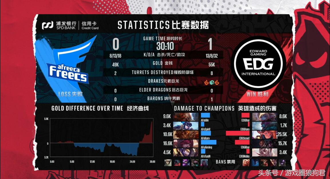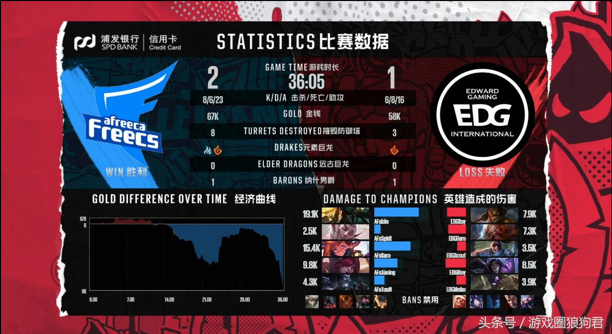 获胜的两支队伍中,EDG对上韩国劲旅AFs。AFs的猪妹前期多次Gank成功取得了优势,但EDG迅速开始抱团挽回局势,小学弟的佐伊全场游走盘活整场节奏。26分钟,EDG拿下火龙后突然发难打出1换4,并顺势拿下大龙。随后EDG强势推进突然结束比赛,拿下LPL本日第二胜。