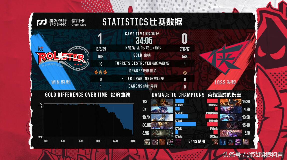 另一边的RW对上了KT,中单Doinb选出男刀试图盘活整场节奏,但却被KT打野频繁光顾,多次逼出大招导致男刀前期静音,KT的中单加里奥抗住了Doinb的疯狂进攻,KT的优势逐渐扩大。26分钟左右,KT抓住RW的一波强开失败反打1换3拿下大龙,并迅速破塔破高地。最终阵容成型的KT稳健的推掉了RW的水晶拿下比赛。