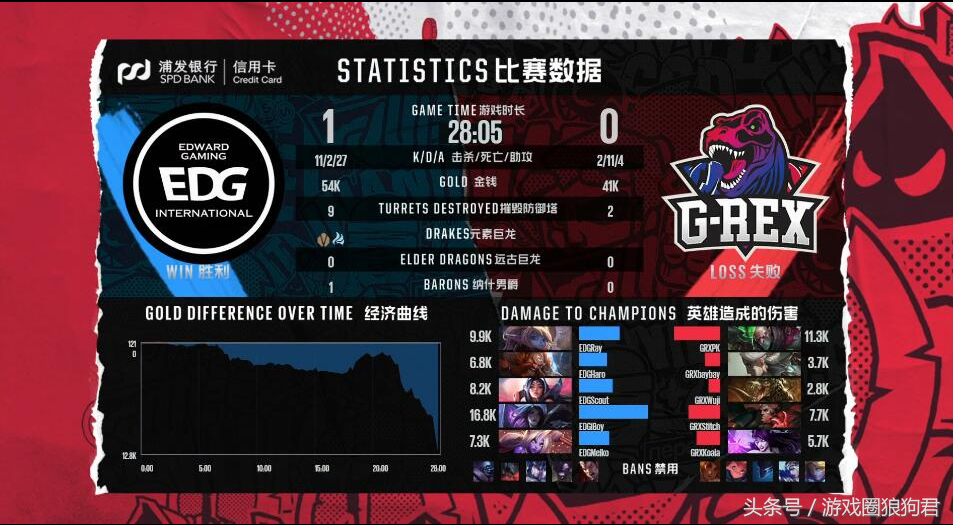 第二天的首战是EDG对上GRX,EDG下路双人组对线期凭借个人实力打出巨大优势,随后资源全收,通过运营把下路优势化为全场优势。虽然中期GRX一度反扑把局势扯平,但随后中路小学弟找到机会配合队友打出一波0换4,并顺势拿下大龙。此时GRX已经无力回天,EDG推掉水晶,拿下小组赛两战全胜。