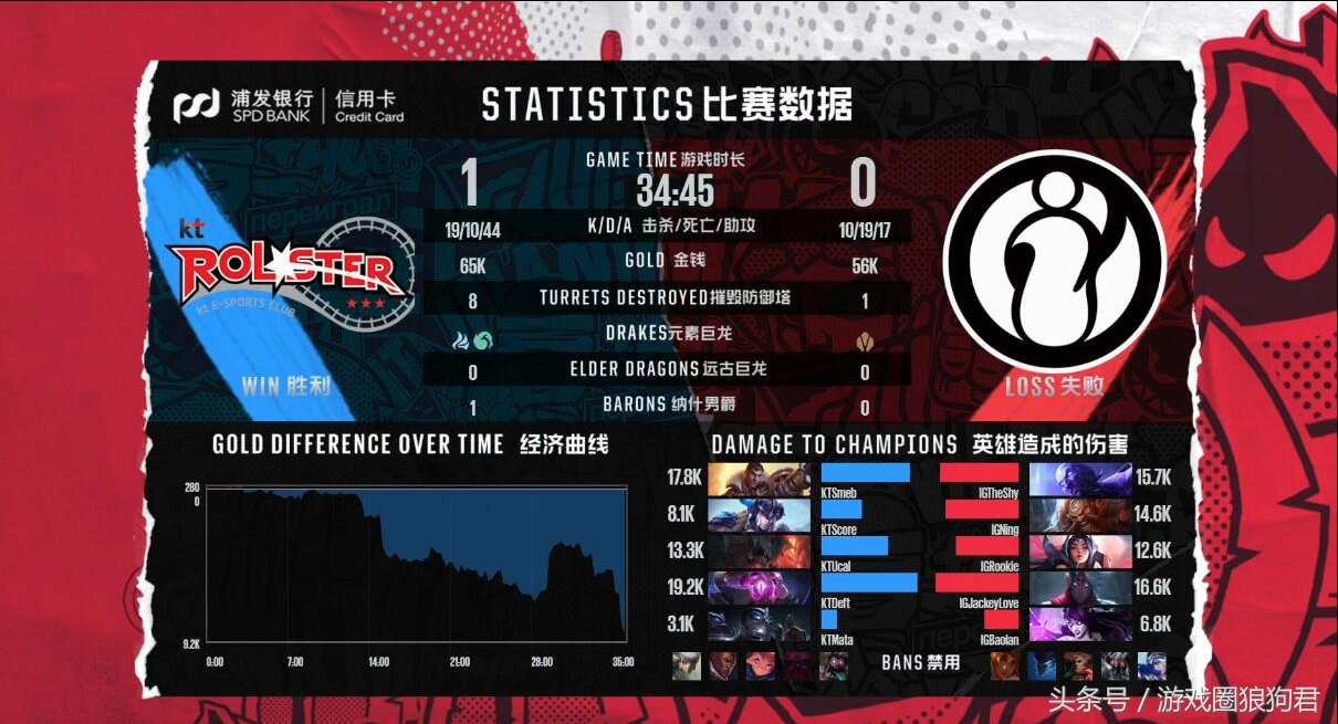 话不多说,第一局首先是由iG和KT打头阵。从BP开始iG就被KT下套,陷入了巨大的劣势。比赛开始后,KT抓准了iG上路瑞兹的疲软连续Gank成功,而疲于奔命的iG中野也让KT下路的维克兹成功发育起来。战至中期,iG已无力抵挡KT的攻势。28分钟,Rookie的刀妹抓住机会单骑突阵,打出一波二换五,但局势并未改变多少,iG最后大龙处的一波埋伏被轻松化解,KT也趁势收掉大龙结束了比赛。