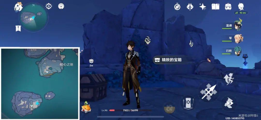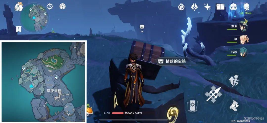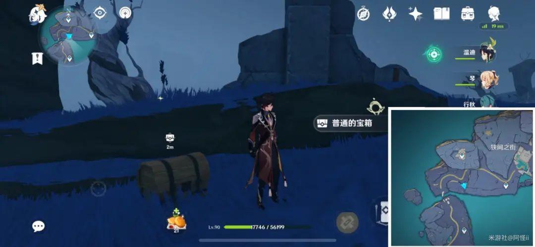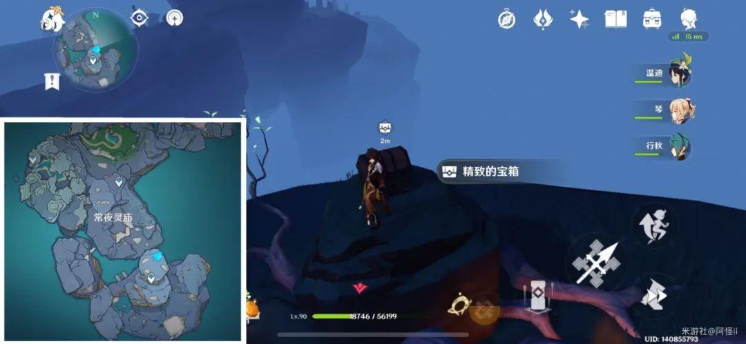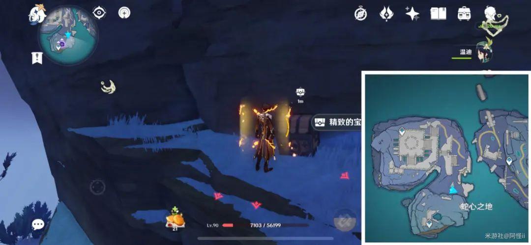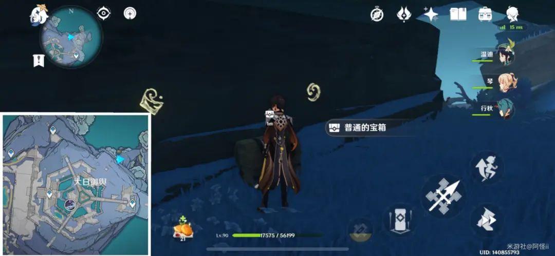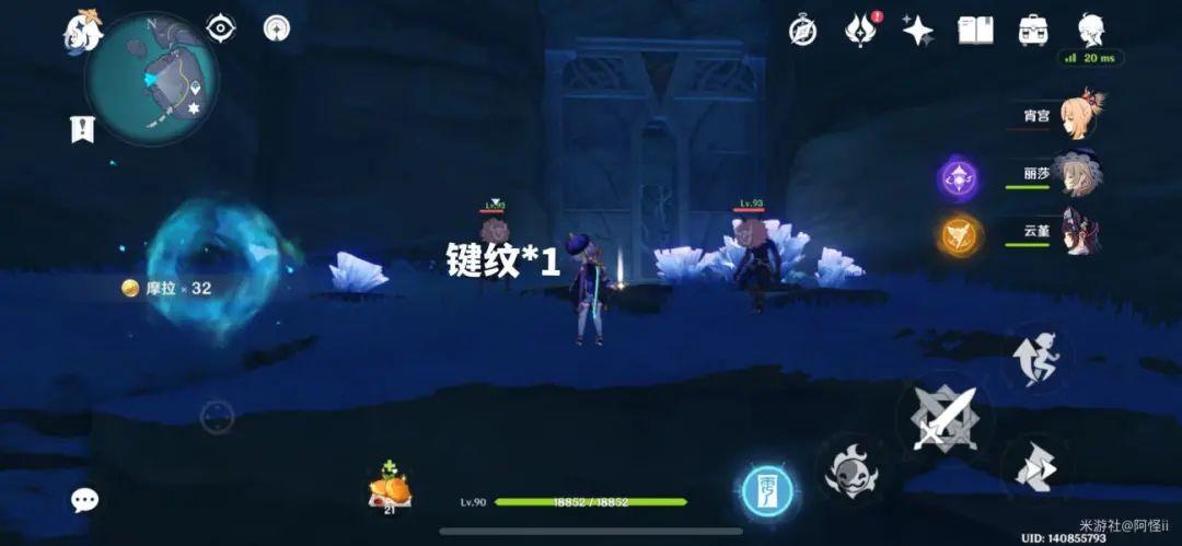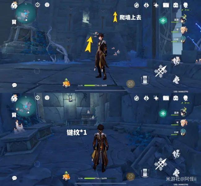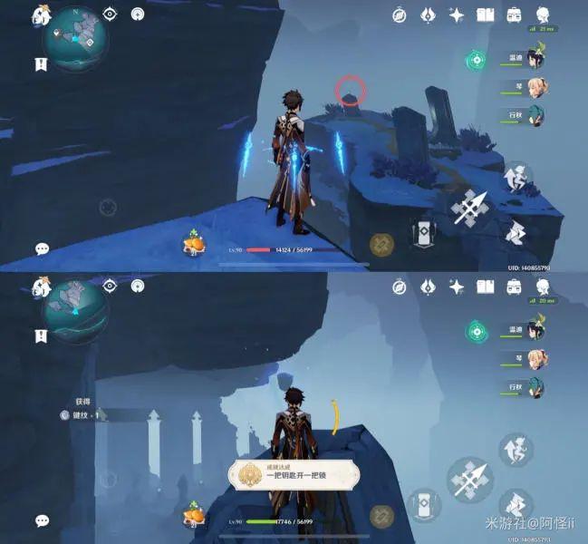 最下方传送点附近能看到一堆丘丘人,上方有一个洞,进去就能看到键纹,旁边还有个摩拉箱子记得捡