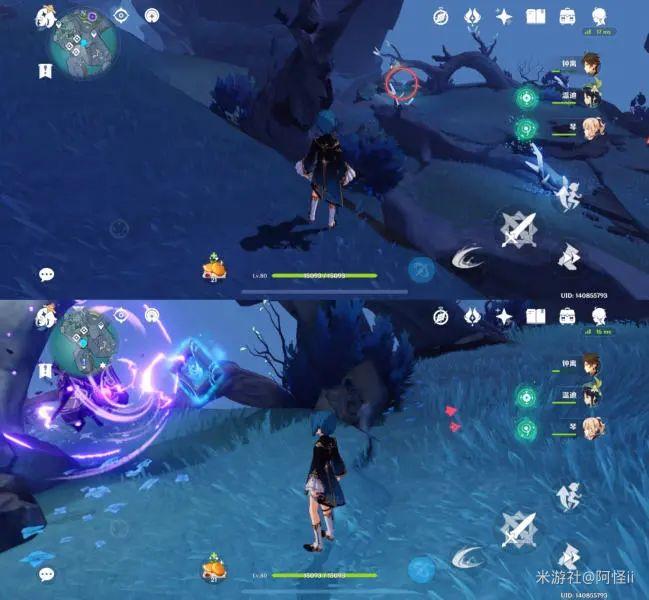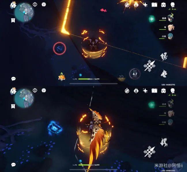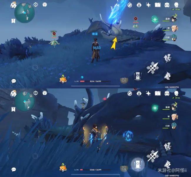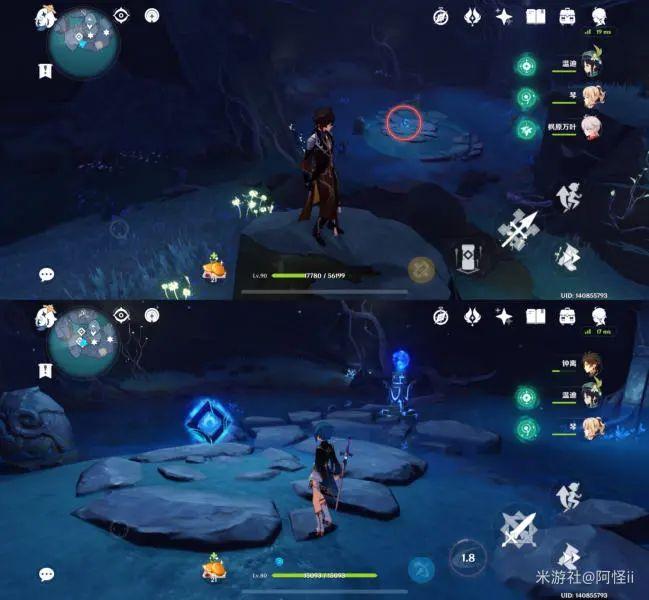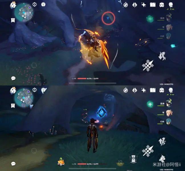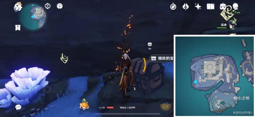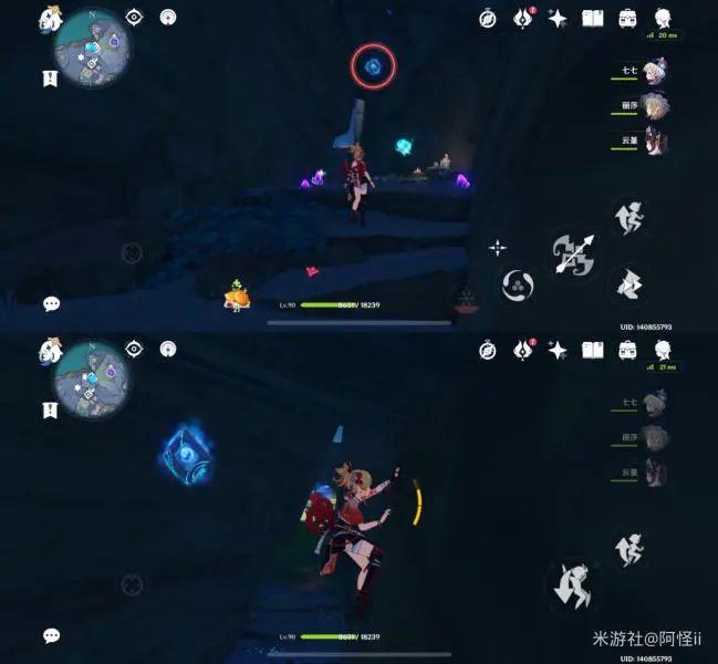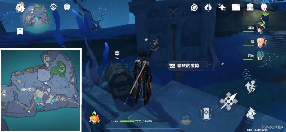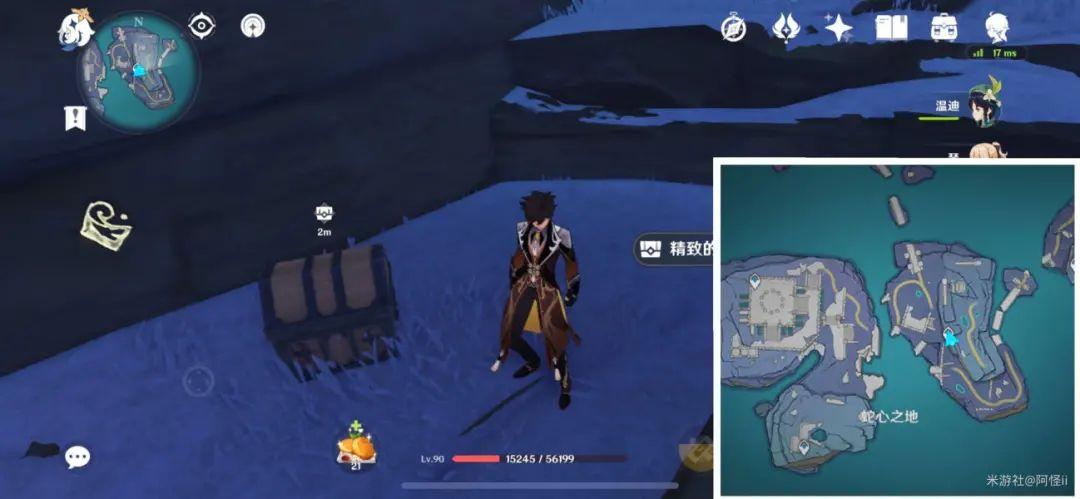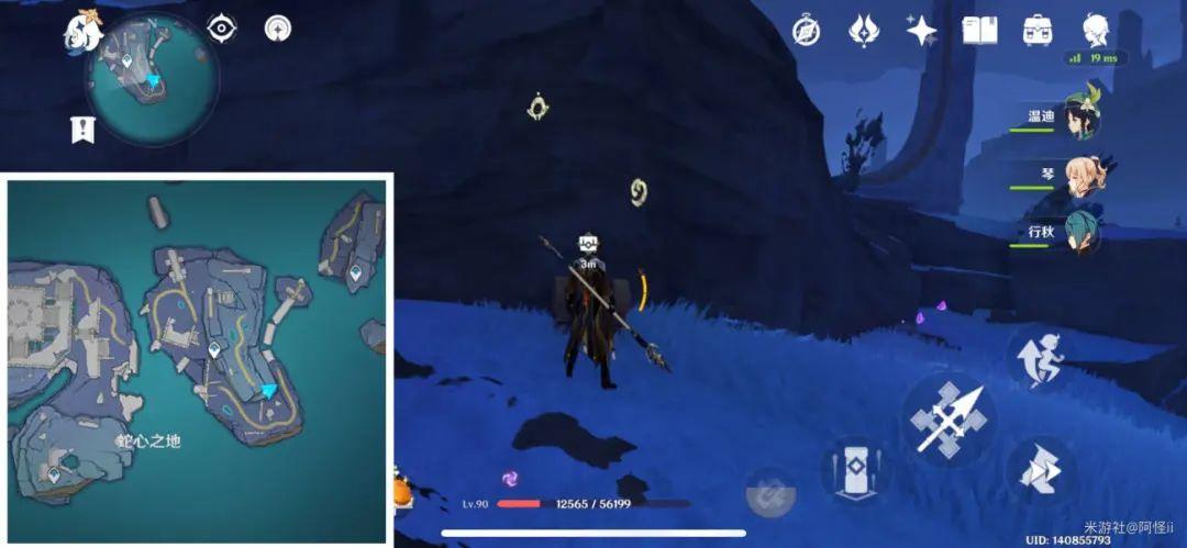 最下方传送点附近能看到一堆丘丘人,上方有一个洞,进去就能看到键纹,旁边还有个摩拉箱子记得捡