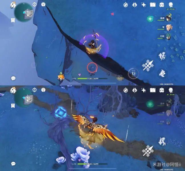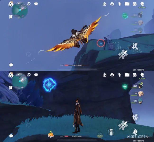 拿完六号位向着悬崖走可以看到一个山洞,抬头能发现一个键纹在两个山之间,爬上山壁往下飞就能获得