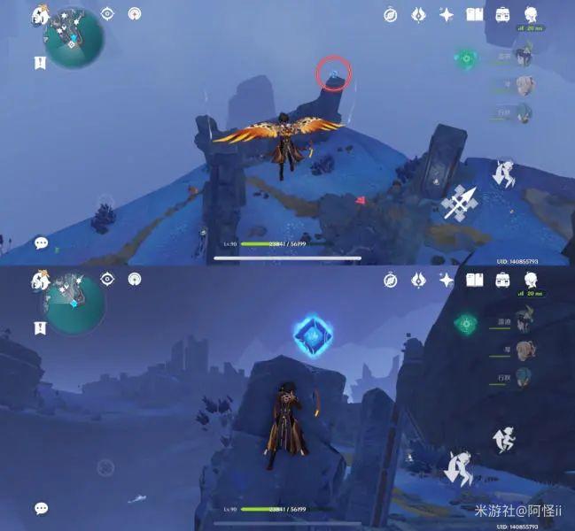 从上方传送点往下飞就能看到在废墟的上方,这边怪怪也拿掉了,键纹在废墟上方两个石块的中间