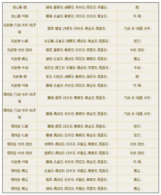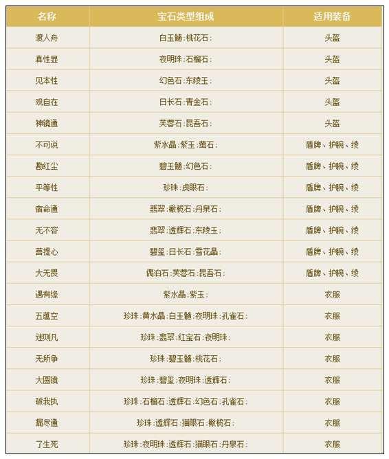 当把宝石按一定的组合镶嵌到特定类型的装备上去,就会产生石之灵的效果,会获得额外的属性。镶嵌没有顺序要求,但是对装备类型有要求。比方说,“勘红尘”石之灵必须在至少有2个孔的盾牌、护腕或绫上才会起作用,如果镶嵌在其他类型的装备上不会起作用。