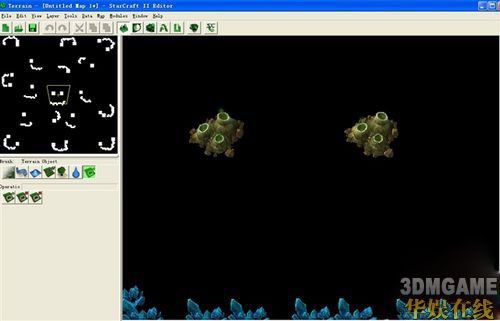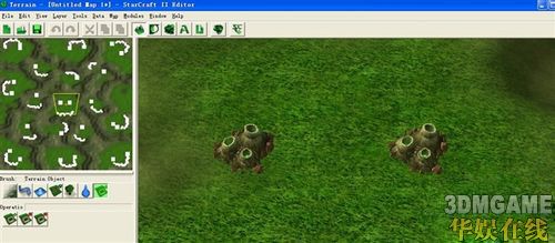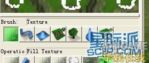 8. 但是我们发现虽然和原来的Big Game Hunters很像,整张地图上看不任何地势高低和障碍物,这就需要我们自己添加了,在地图编辑器左侧,有各种Brush,依次为纹理、道路、高度、峭壁、植物、水、地面物体。