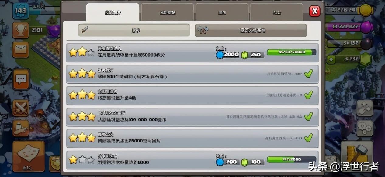 部落冲突的成就系统算是白嫖宝石的最大渠道了,很多小伙伴初期就是靠它才把自己的建筑工人凑齐,大部分的任务都需要靠时间来积累,也不用特意去完成,小伙伴们只要平时多注意多打打部落战,捐捐兵,有时候不注意就能满足条件领取奖励。
