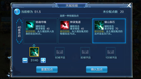 异人技能栏里的技能是可以更换的,自己可以设置不同的需求(自己命名),其中天赋技能的更换,先设置增加自身的法术攻击(技能点加满),召唤木灵,再设置成增加鬼灵的法术攻击,之后鬼灵的法术攻击会继续往上叠加,挂机很费药的,建议种植、钓鱼、炼药、烹饪前期都学1级,保证正常供给。