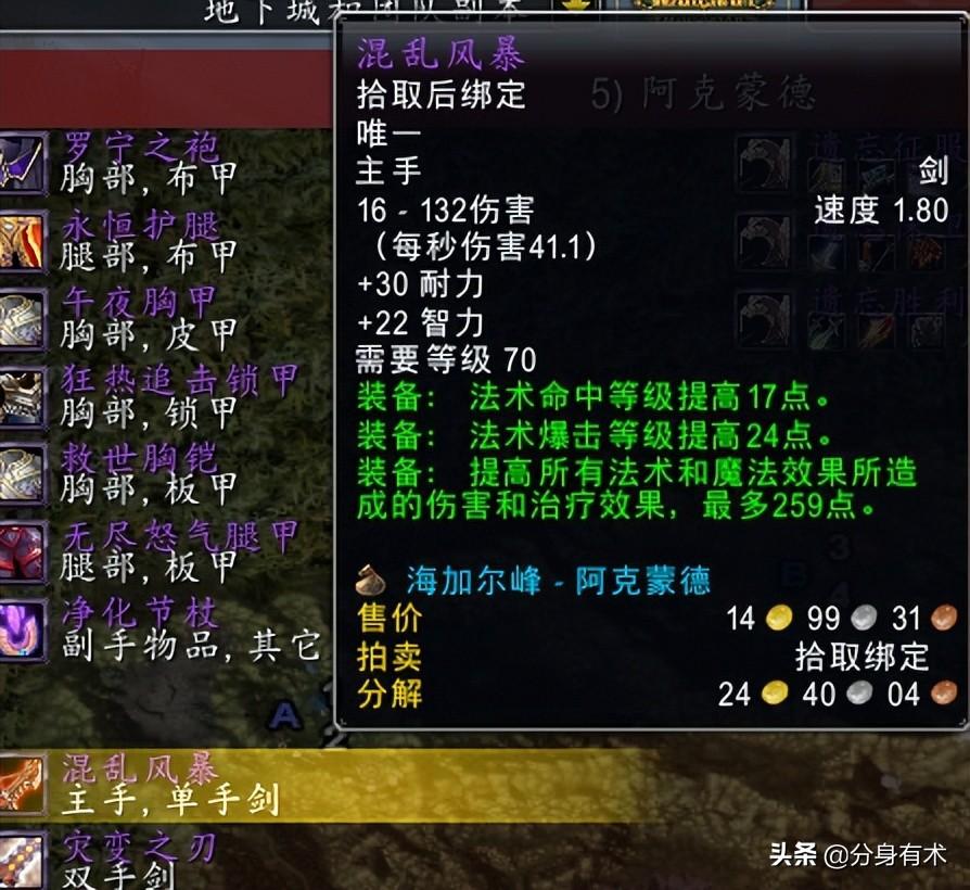 其它的装备全部选择堆三维属性的既可,武器可以选择海山小怪掉落的审判之锤,或者阿克蒙德掉落的混乱风暴,这样我们在涂油吃药之后基本可以达到600点左右的法伤,而且三维属性比较高。