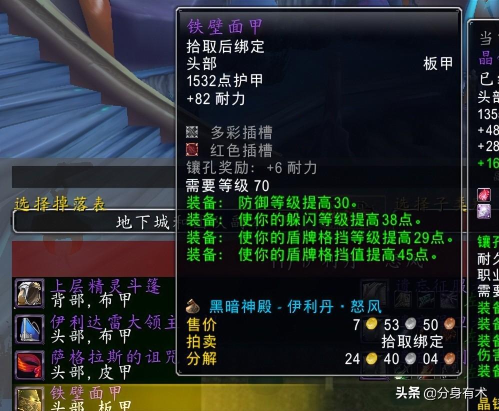 那么4t6选择,手套、裤子、肩膀、衣服,接下来头部选择铁壁面甲这件装备虽然是不加法伤的,但是它的三维属性加的特比的高,可以说碾压了骑士的t6套属性,比t6头足足多出了29点的格挡等级,要知道附魔盾牌格挡也才加15点格挡等级,相当于附魔了2次。盾牌的选择祖阿曼掉落的阿曼尼壁垒,或者伊利丹掉落的埃辛罗斯壁垒,建议使用阿曼尼壁垒,不仅便宜,而且在单刷城墙上,阿曼尼壁垒是要好于埃辛罗斯壁垒的,因为它加了格挡等级还有一个红色宝石槽,还可以多一个躲闪宝石。