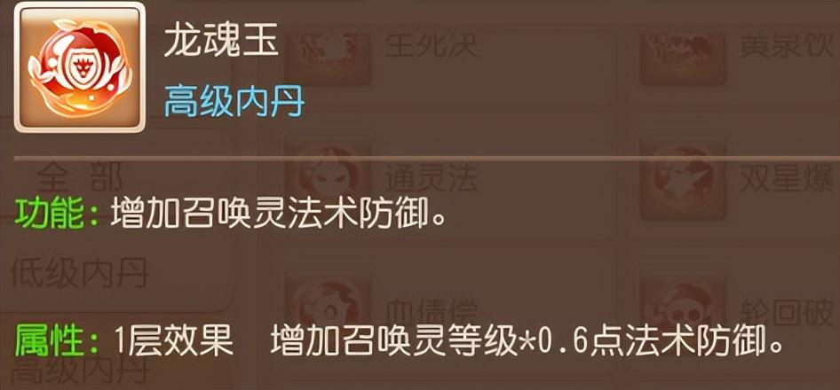 作为同样增加属性的高级内丹,增加法防的龙魂玉与玄武躯有着异曲同工之妙。但因为龙魂玉本身只针对法系输出,不如玄武躯那么全面,因此在龟速召唤灵的使用上也相对较少。