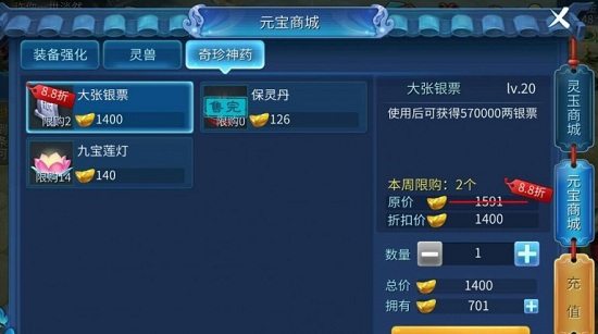神药部分:宝灵丹每周10个,必买,除了日常任务外,经验只能通过刷怪和这个来获得。