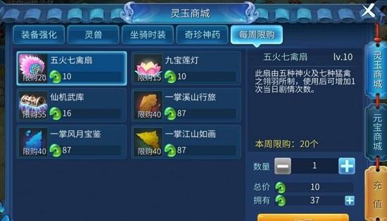 限购区:前期五火七禽扇必买,增加剧情次数,又有经验又爆鬼,为什么不买呢?其他的性价比较差,一掌可以通过玩家商店去买,银两不够买银两。