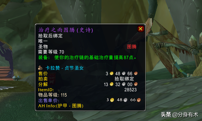 第三件装备:治疗之雨图腾,奶萨的极品图腾,可以说是版本毕业的,毕竟萨满要毛治疗量,主要就是靠治疗链这个技能,而这个图腾刚好又是加治疗链的基础属性,因此很多后期练萨满小号想吃排骨的玩家,基本都要来卡拉赞刷这个图腾。