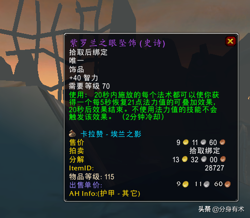 第五件装备:紫罗兰之眼坠饰,这件装备是智力流奶骑的bis,而且对于奥法来说也有一定的用处,因此这件饰品还是挺多人需求的,算是埃兰之影最好的掉落了。