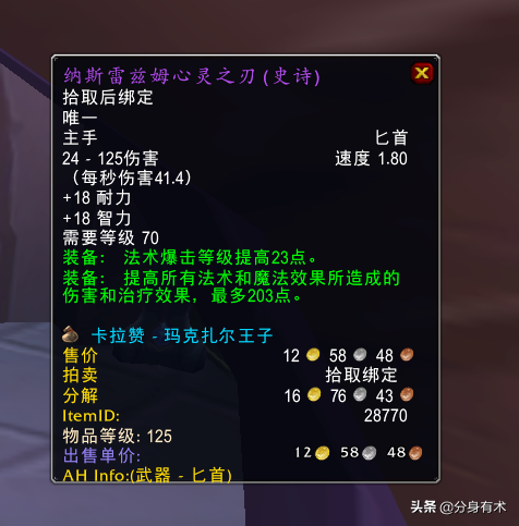 第六件装备:纳斯雷兹姆的心灵之刃,小号法系初期最好的匕首了,不少法师和术士满级打卡拉赞的动力就是这把匕首了,现阶段卡拉赞想要分到金,离不开这件装备。由于是尾王掉落的,这件装备还特别好找老板。