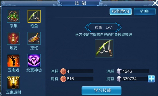 消耗帮贡、银两或银票来学习“钓鱼”技能。