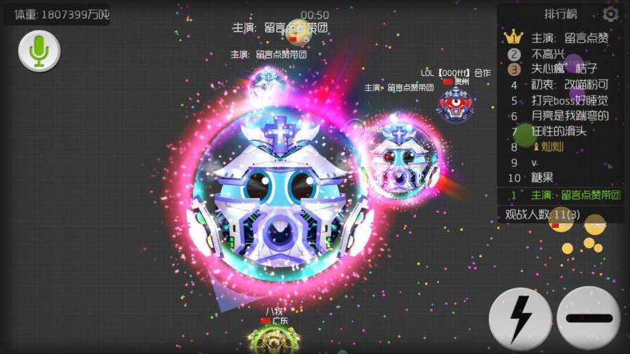 分身之后,小伙伴们要学的就是吐球了。吐球是将你刚刚吃进去的那些体重给变成孢子吐出来。再吃下去后你就可以变大。分身为二后,你就从一个大球球变成两个小球球。点击闪电键,就可以吐球球。将其中一个小球里的所有孢子都吐到另外一个小球上,就变成1个小球1个大球。这样比较不容易被人吃掉,而且还可以再分身吃人,小球球还可以充当斥候,先跑到前面去看看有没有比你大的过来了。