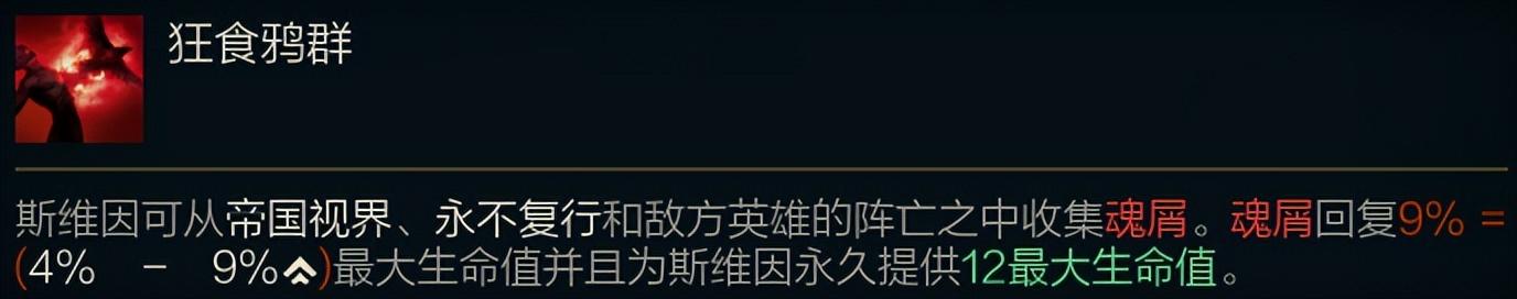 魂屑恢复的血量和加的血量比之前更多。乌鸦可以通过W(帝国视界),E(永不复行)来获得魂屑,包括敌方英雄阵亡。图上的其实描述并不清晰,首先就是E技能,就算E技能中了,也必须再按一次E(拉回)才能获得魂屑,最明显的情况就是你E中了,但你在没有拉回之前死了是不能获得魂屑的。而被动则是附近敌方英雄死亡,不需要打助攻也可以,范围在半个屏幕左右。