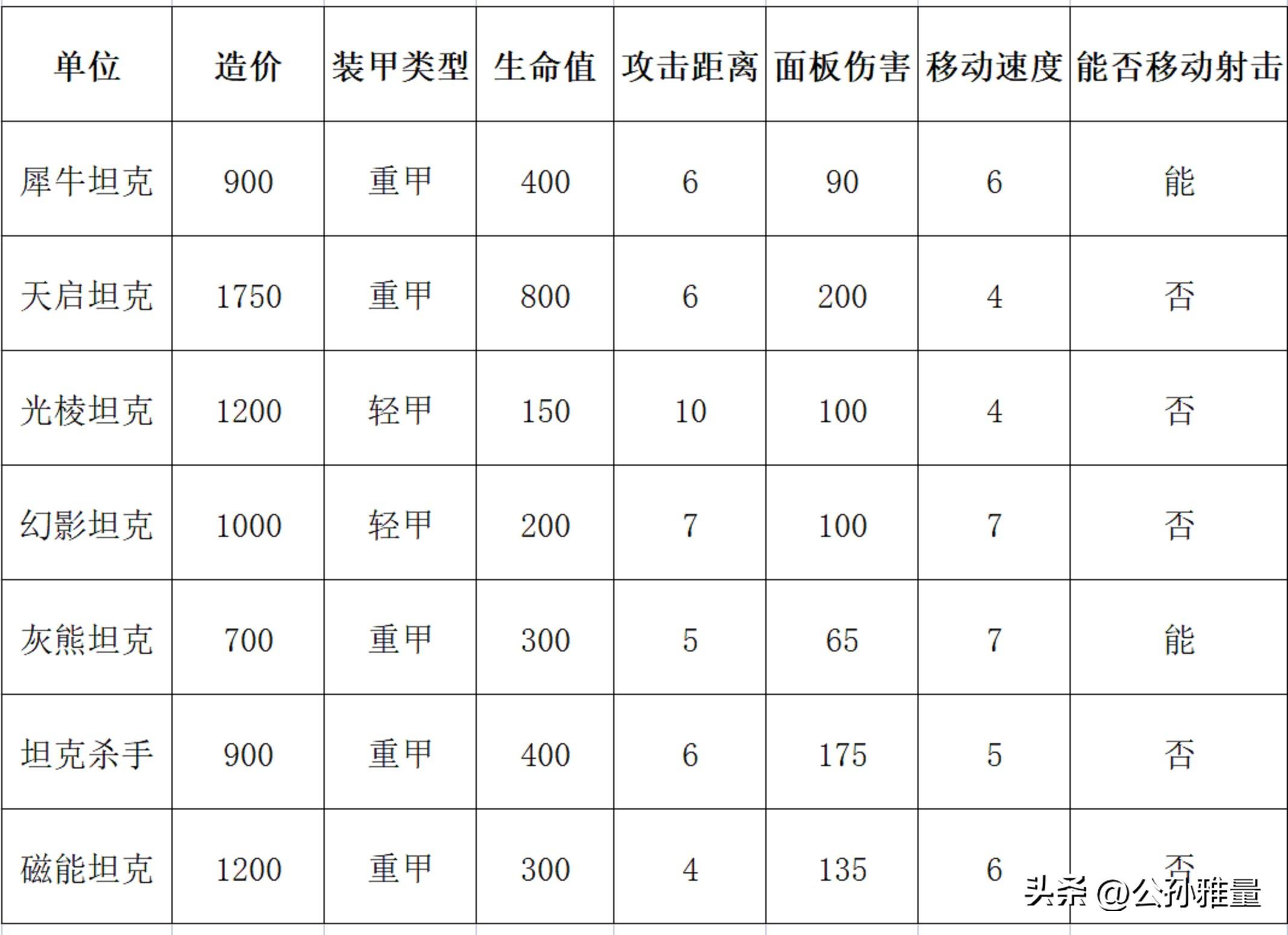首先是天启坦克,虽然皮糙肉厚、攻击力强悍,但是造价太高、行动力缓慢。天启坦克一辆1750元,几乎是犀牛的的两倍,出场时间也慢,还需要以作战实验室为前提。