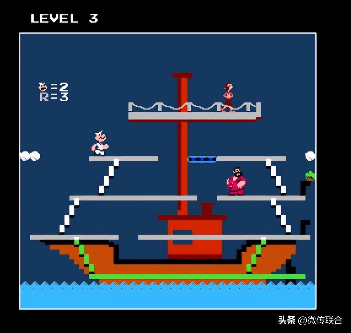 第3关没有了扔骷髅的海魔女,主角在底层作战很方便,耐心和Bluto周旋。虽然左上角登场的秃鹰也会沿曲线飞到底层,显然威胁比骷髅小多了,毕竟每次只登场一只秃鹰,而且飞行路线清晰可见,骷髅却是以数量和移动路线随机性取胜。
