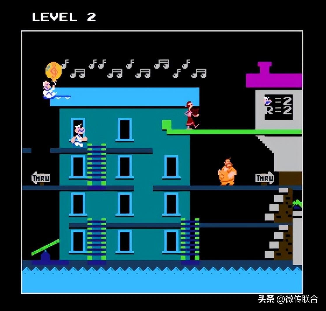 地形变复杂了,难度上升较大,虽然第3层两侧有“THRU”路牌,但楼层中央部分有断层,主角没有跳跃功能,走到那里就会坠落,布鲁托却如履平地,直接走过。尽管如此,却不用怕,尽快熟悉地形后就好办了,基本战术与第1关一样,平时在高层与布鲁托周旋,有音符漏下去了,立即找机会下去拾取,小心应付骷髅,拿到音符后立即回到高层。